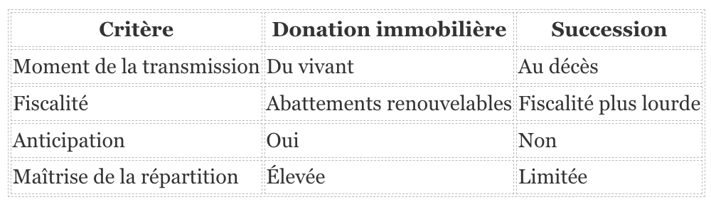La donation d’un bien immobilier ne doit jamais être envisagée de manière isolée. Elle s’inscrit dans une stratégie patrimoniale globale, qui doit prendre en compte plusieurs éléments essentiels. Il est notamment indispensable d’anticiper les conséquences sur la succession, d’évaluer l’impact en matière de fiscalité, de réfléchir à la protection du conjoint et d’analyser les revenus futurs du donateur afin de préserver son équilibre financier.